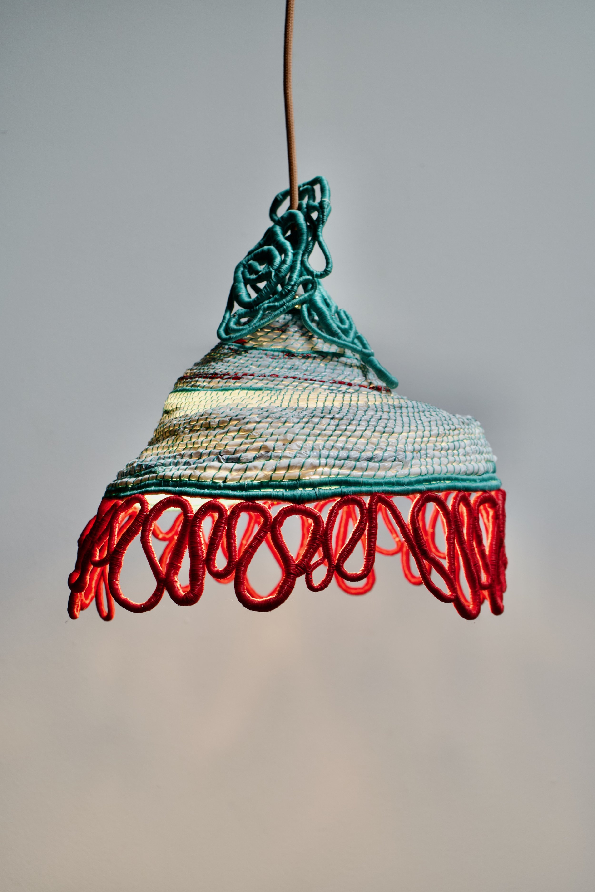 Polypropylamp, 2024. Plastic bags, waxed cord, lamp cord.